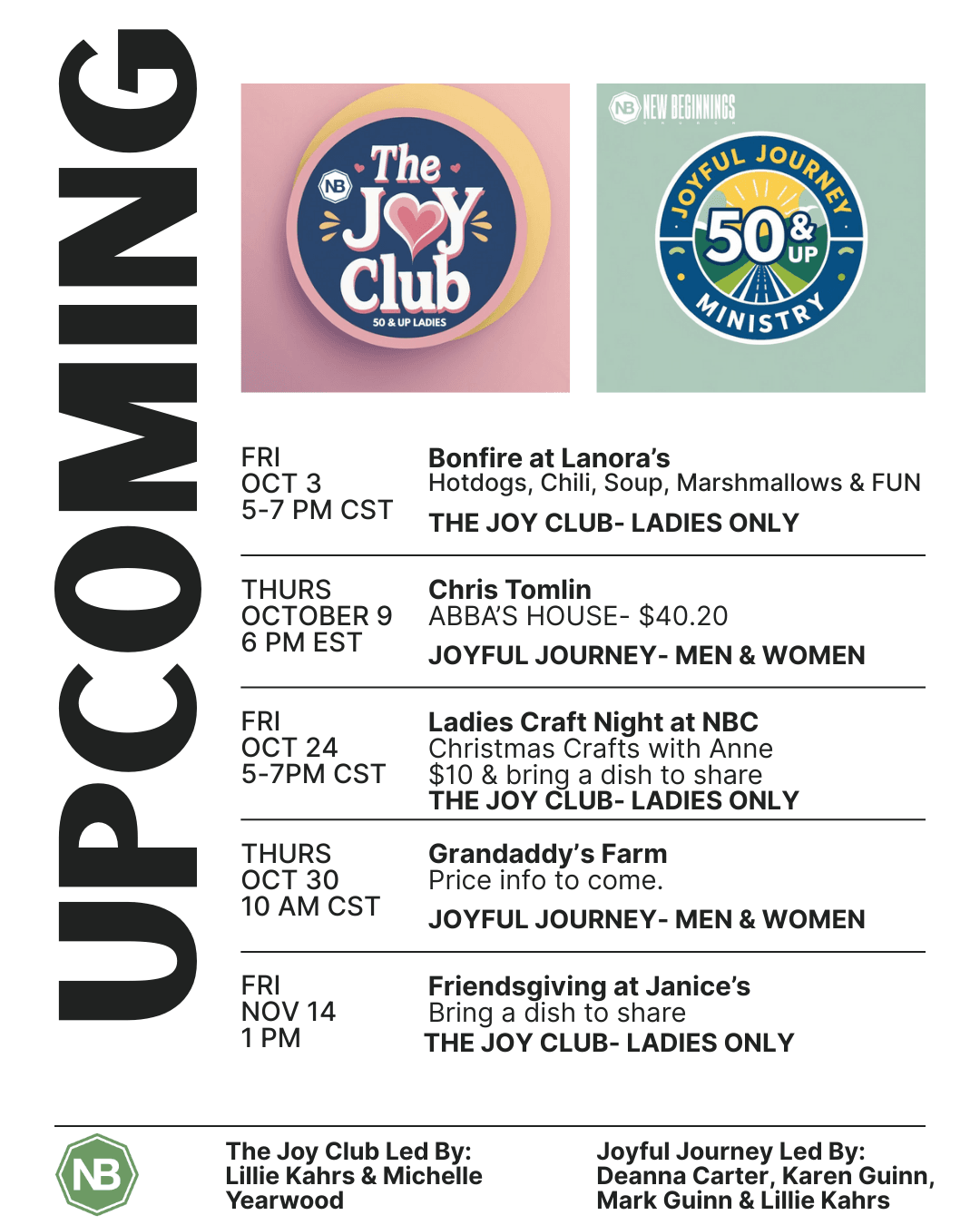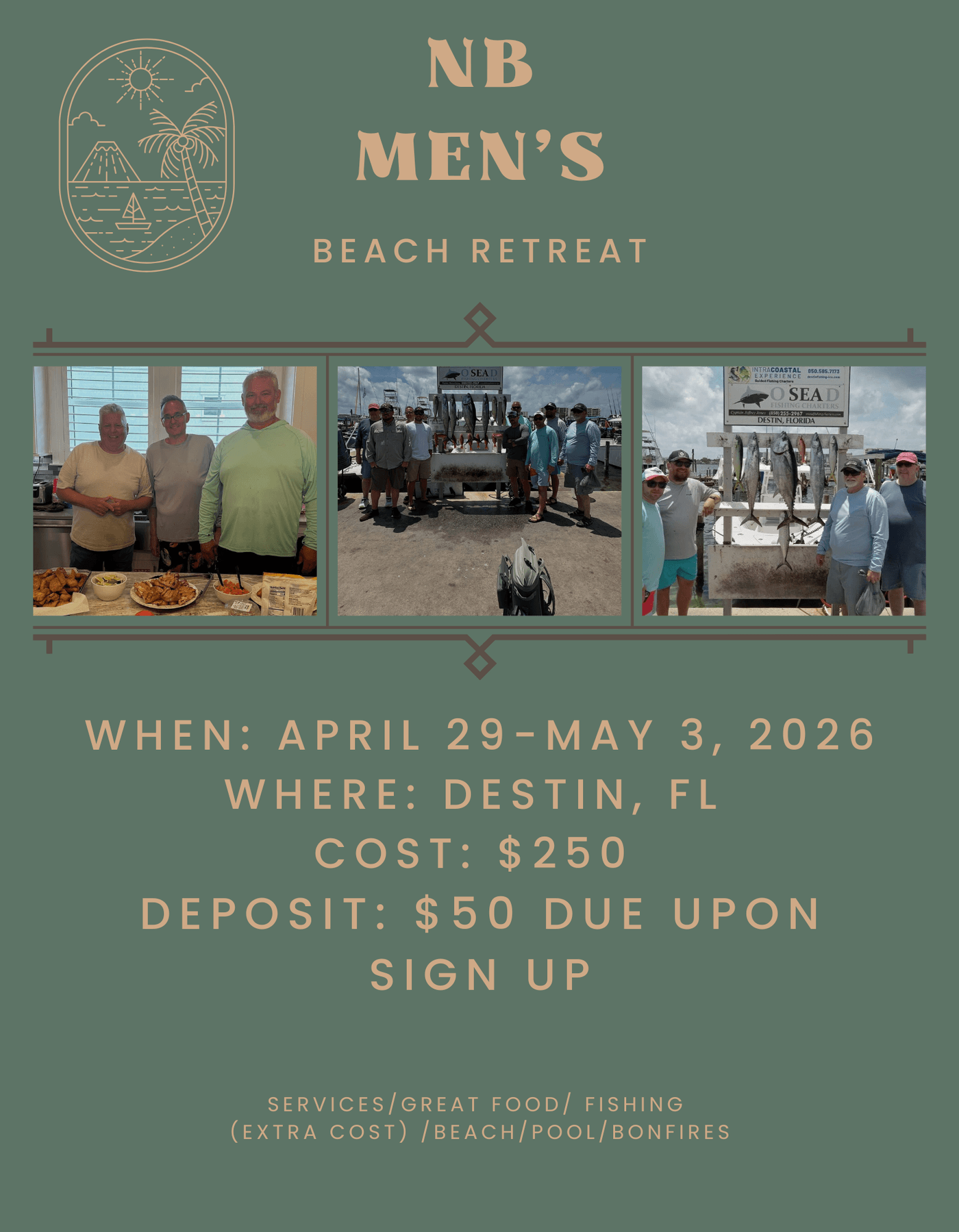 We believe that one of the greatest ministries we can provide is helping men grow in their faith in a community of wisdom and encouragement. Our goal at NB men's ministry is to simply help provide opportunities to make that happen. NB men's ministry is all about creating opportunities to grow spiritually, to serve in our community and church, and to build deeper relationships through fellowship. NB men's ministry is for men ages 18 and up, with a weekly Discipleship Group as well as special events and opportunities for the younger guys to get involved in from time to time.