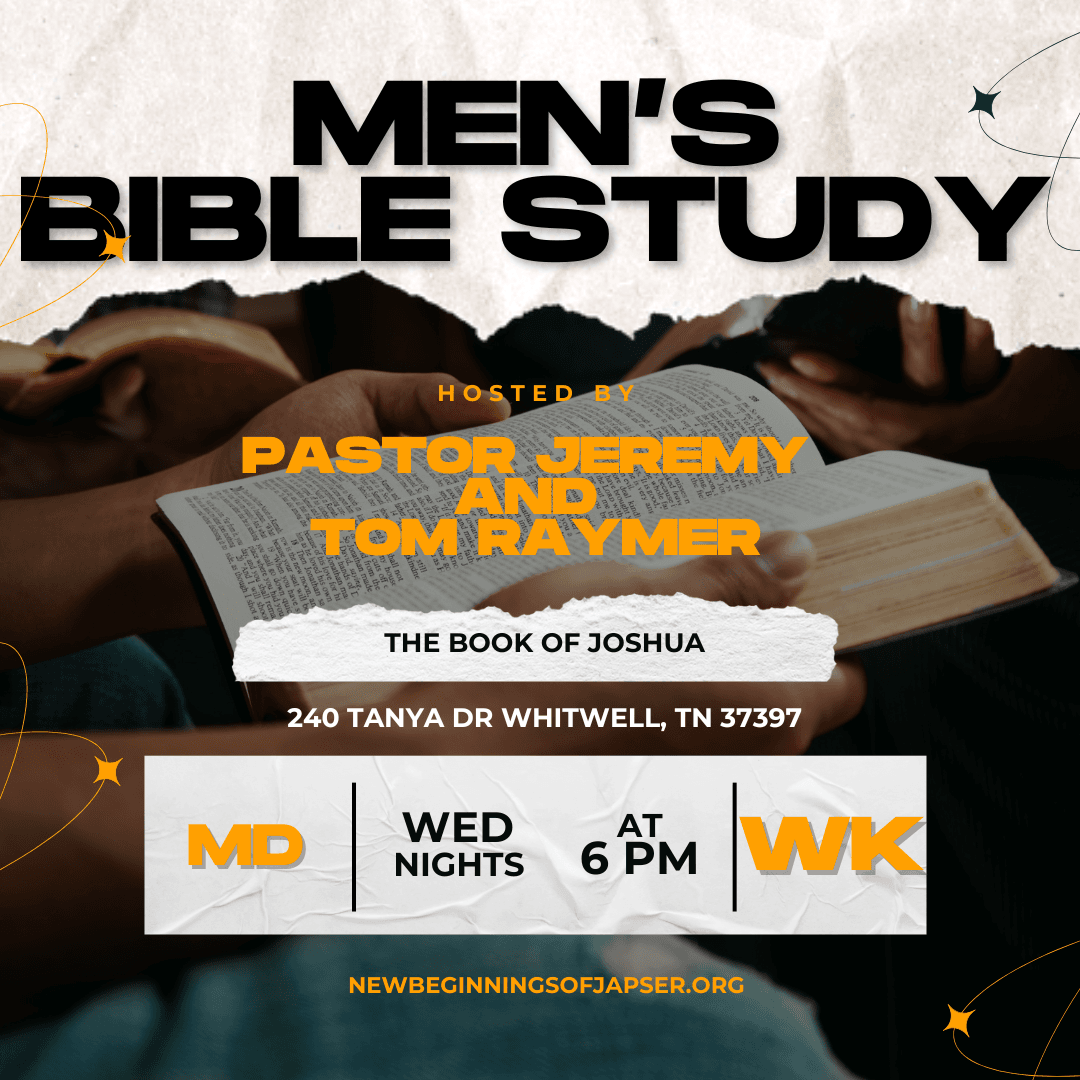 Adults – Men join us at Pastor Jeremy's as we study the book of Joshua at 6 pm.
