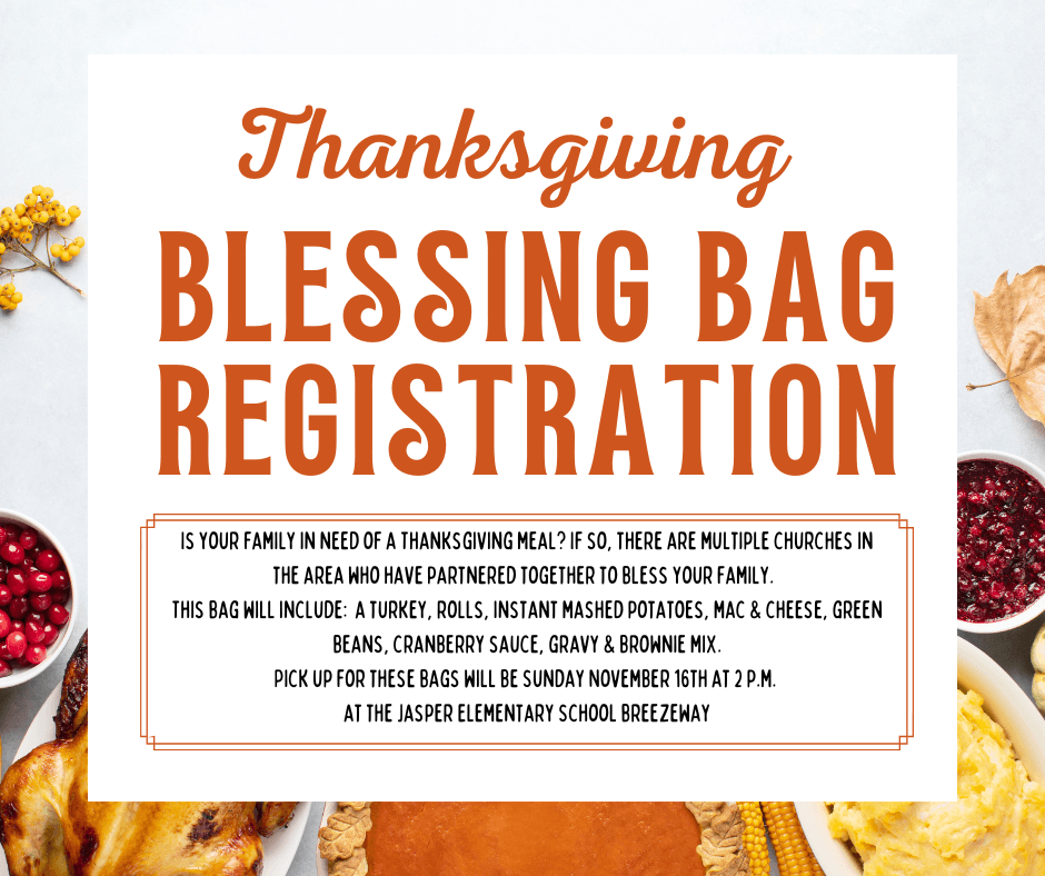 Join us as we pass out Thanksgiving bags on Sunday, November 16th at 1 PM at the Jasper Elementary School Breezeway. Sign up below if you’d like to help!